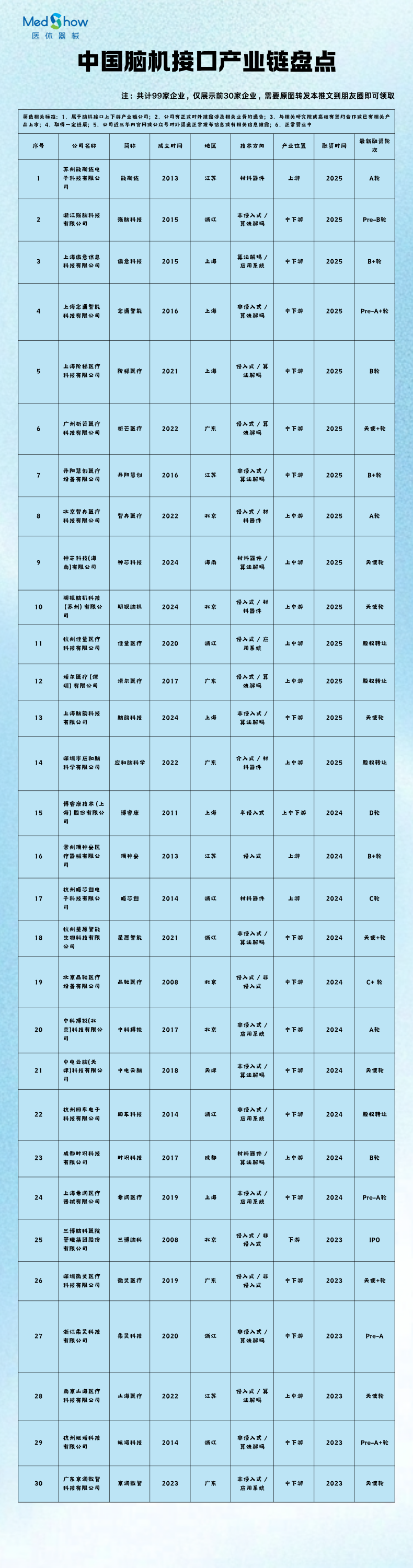 截止至2025年10月,据医休器械研究院不完全统计,中国与脑机接口产业链强相关的公司已经达到99家。