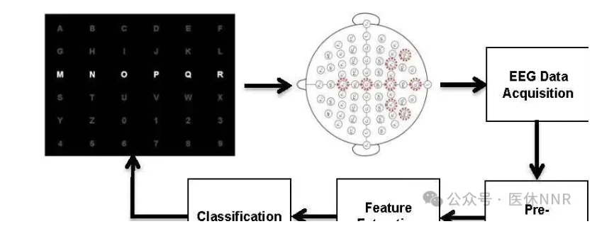 典型的P300信号幅值约5–10微伏,潜伏期220–500毫秒,在头皮中央偏顶区域(如电极Pz、Cz)最为明显。基于此原理,科研人员发明了P300脑控拼写器:将字母数字排成矩阵轮流闪烁(或者由声音/触觉呈现序列),当用户集中注意某个目标字符时,每当该行列被闪烁时都会在其脑电中诱发P300波,系统据此识别出用户所关注的字符。1988年Farwell和Donchin的开创性工作证明了P300拼写输入的可行性,至今P300拼写器已成为BCI领域的标准应用。