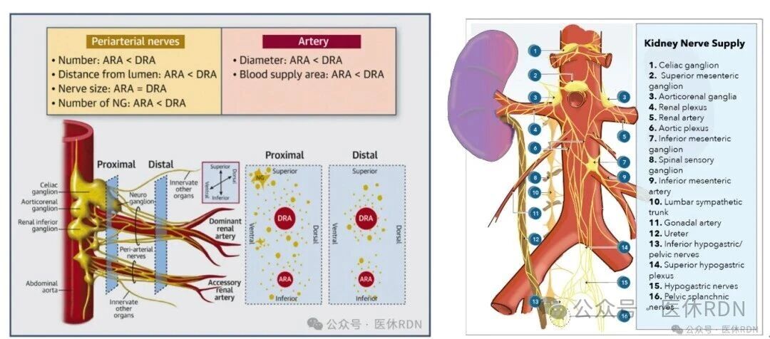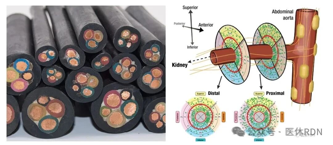 我们在网络上看到关于肾动脉交感神经的图,基本都是示意图,并不是肾动脉周围神经分布的真实样子,实际的肾动脉交感神经分布远比这个复杂。实际上,每条肾动脉主干包含200条神经,75%-95%的神经距离血管内膜<4mm。而理解和弄清楚肾动脉周围密集分布的肾交感神经,是后续开展经导管RDN手术的解剖基础。