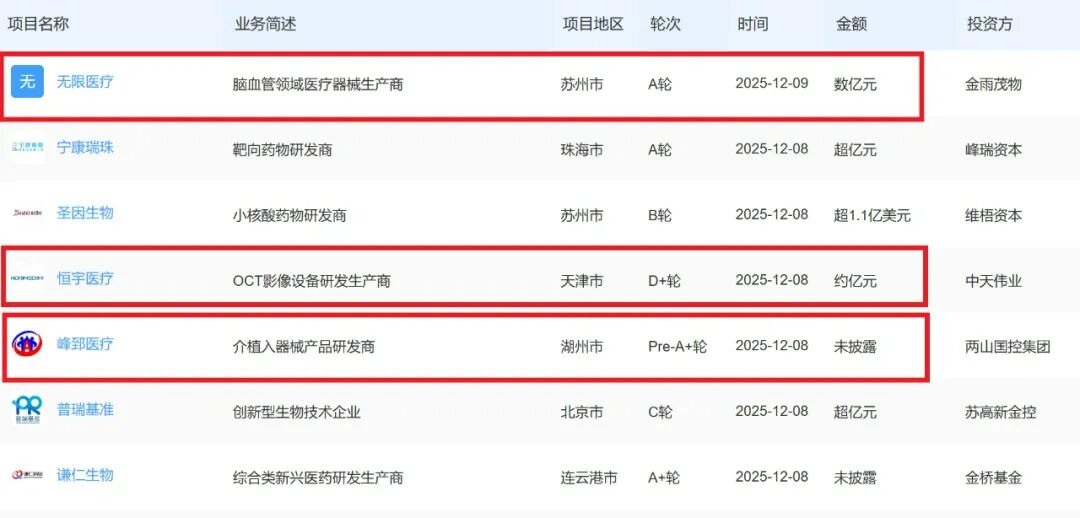 其中,无限医疗(苏州市)作为脑血管领域医疗器械生产商,于12月9日完成A轮融资,金额达数亿元,投资方为金雨茂物。该公司致力于脑血管疾病治疗器械的研发与生产,此次融资将助力其加速产品管线布局与临床转化。