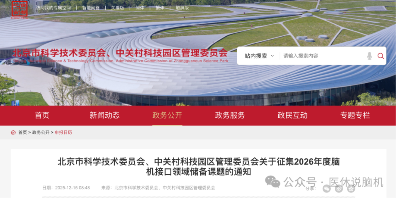 大家好,我是康复哥。继江苏的课题申报后,北京也开始征集脑机接口的课题啦。为深入落实《加快北京市脑机接口创新发展行动方案(2025-2030年)》(京科发〔2025〕2号)的重点工作任务要求,解决北京脑机接口创新发展重大需求,培育脑机接口产业创新生态,支持优势区域建设脑机接口产业集聚区和产业园,现征集2026年度脑机接口领域储备课题,具体方向内容如下: 一、征集方向 (一)创新产品研发 1.半侵入式与侵入式产品 支持方向:支持面向运动替代与康复、神经和精神类疾病、视听感知重建、学习障碍、语言障碍、特殊场景等开发半侵入式、侵入式或其他新型产品,以及闭环神经刺激和调控设备等,实现疾病治疗、功能康复、功能替代等。 研究目标:核心关键参数(如信号采样率、刺激参数精度等)达到国际或国内领先水平,完成产品研发与医疗器械第三方型式检验,开展临床试验,形成临床试验报告。 2.非侵入式产品 支持方向:支持开发感知评估类、情绪检测与调控类、控制交互类、认知增强类、安全识别类等产品,创新额贴式、耳贴式、入耳式、发夹式、靠枕式等产品形态,研制智能闭环电刺激等神经调控设备,实现非侵入式脑机接口产品规模化推广。 研究目标:完成产品研发,核心关键参数(如在线识别准确率等)达到国际或国内领先水平,满足应用场景使用需求。 3.辅助设备 支持方向:支持开发基于多模态信号的生理监测设备、超高场磁共振设备、脑磁图、便携式神经活动调控设备,以及脑控机械臂/机器人、外骨骼、脑-具身智能共生交互系统、智能辅具等,支撑脑机接口系统整体集成度和效能提升。 研究目标:完成产品研发,核心关键参数(如在线意图解码准确率、指令执行延迟等)达到国际或国内领先水平,满足应用场景使用需求。 4.多应用场景验证 支持方向:扩大脑机接口产品在典型场景的验证应用。在医疗领域,提升疾病预防、诊断、治疗及全病程管理水平;在康养领域,提升产品的功能多元化、需求个性化、操控智能化水平;在工业安全领域,提升作业效率和安全运行水平;在教育体育领域,推动注意力状态评估与自适应训练,优化教学质量、提高训练效果;在智慧生活领域,提高人、机、物多元智能交互的自主性、准确性、灵活性、泛化性和安全性。 研究目标:聚焦至少1个上述典型应用场景,完成脑机接口产品的场景化适配、验证及落地试点,形成科学完整的应用评估报告,构建可复制、可推广的商业模式。通过场景化验证,实现核心技术指标达标、用户体验优化,为脑机接口技术规模化落地奠定基础。 (二)核心零部件开发 1.电极 支持方向:支持开发高通量柔性深部电极及精准植入技术,超薄高密度柔性皮层电极及微创植入技术,高抗扰便捷式无创电极阵列,基于磁、声、光、化学及多模态的新型脑信号传感器等新型电极,提升脑信号采集质量与神经刺激精准性。 研究目标:核心关键参数(如通道数、植入深度、电极位点空间密度、阻抗、刺激深度、生物相容性等)达到国际或国内领先水平,完成性能测试与验证。 2.芯片 支持方向:支持开发脑机接口高通量采集芯片、采集-刺激一体芯片、高数据带宽低功耗无线传输芯片、专用神经信号处理器芯片、无线供能与电源管理芯片等,实现对神经信号的高效采集、精准刺激、稳定传输、高效处理与稳定供能。 研究目标:核心关键参数(如通道数、噪声水平、带宽、功耗等)达到国际或国内领先水平,完成性能测试与验证。 3.编解码算法与软件 支持方向:研究弱隐刺激和自然视觉刺激诱发的脑电编码范式,支持面向感知觉、运动、语言、情感等范式开发专用编码软件,支持构建基于大模型的脑机接口解码模型,研发面向特定任务的神经信号解码与个体化闭环调控算法,突破微弱神经信号特征识别、精细运动解码、视听觉语言解码、刺激-响应调控参数优化、无人系统生物智能模型迁移等技术,开发具备高鲁棒性、高实时性的解码软件。 研究目标:开发编码软件,核心关键参数(如可编码指令数、单个指令响应时间、指令识别准确率、自主决策成功率等)达到国际或国内领先水平;开发多任务范式适用解码算法,核心关键参数(如解码准确率、解码延迟、适用任务数、刺激参数精度等)达到国际或国内领先水平。 (三)服务平台建设 1.数据、算法等开源平台 支持方向:围绕基础共性需求的关键软件、数据集、工具模型等,开发脑机接口领域开源平台,制定多模态生理数据表征标准化规范,聚焦神经信号的处理、分析和解码,提供模块化工具链,包含数据集、解码算法、多模态脑机接口基础模型、范式设计工具等,具备采集、处理与反馈等功能,同时兼容多模态信号采集设备、支持多种操作系统。 研究目标:支持windows、Linux、Andriod、macOS等操作系统,兼容不少于5种模态信号,数据集不少于10TB,解码算法不少于5种任务,系统解码延时<0.5秒。 2.概念验证和中试平台 支持方向:面向脑机接口技术研究、核心零部件研发、产品开发等不同阶段需求,建设符合标准的概念验证平台和中试平台,提供电极、芯片与材料性能测试、信号采集与特定任务解码算法有效性验证、动物实验验证、微纳工艺研发与加工制造等服务。 研究目标:搭建GLP标准的概念验证平台、GMP标准的中试平台,探索脑机接口研发服务模式,服务不少于3个用户,提升脑机