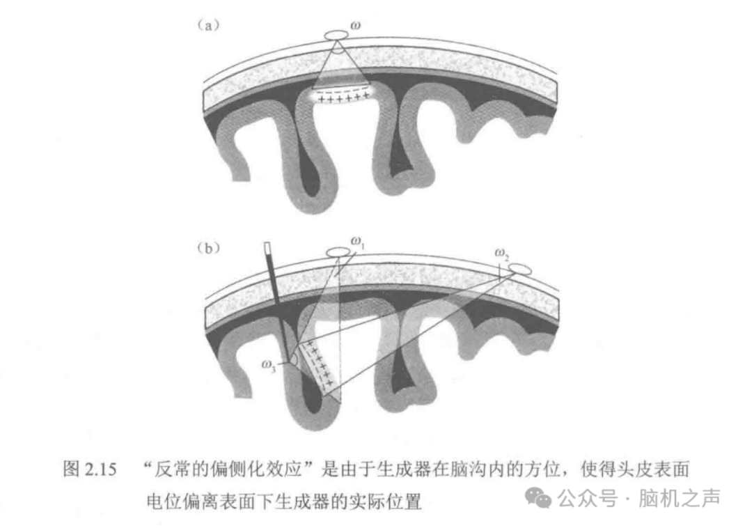 再说偶极子方向。脑皮层不是一张平板,它有脑回和脑沟。电活动源通常可以用偶极子来近似描述,而偶极子方向可能是垂直于皮层表面、平行于皮层表面,或者倾斜的。方向不同,头皮上哪个位置更容易“看到”这个源,会完全不一样。章节里讲了一个很反直觉的现象:如果源在脑沟里,方向使得某个电极同时“看到”正负两端,电位可能互相抵消,导致电极正上方反而测到接近0;而旁边甚至对侧反而更大,于是出现所谓“反常偏侧化”,看起来像是左右搞反了。很多人第一次见到这种现象会以为数据错了,或者以为大脑在“跨半球主导”,但实际上只是几何结构和方向把你绕晕了。