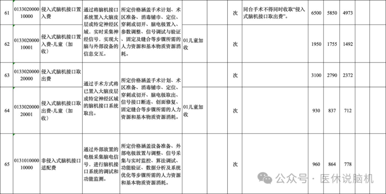 1. 侵入式脑机接口置入费,一类价格最高可收6500;