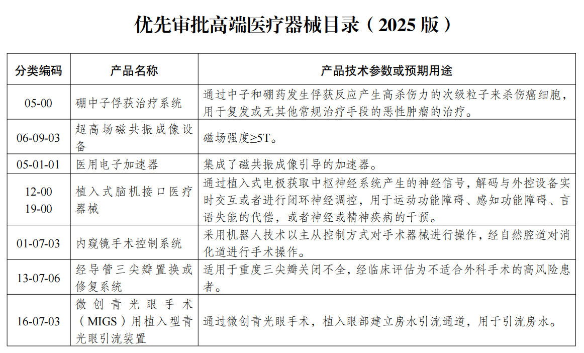 12月26日,国家药监局发布《优先审批高端医疗器械目录(2025版)》(以下简称《目录》)。《目录》包括硼中子俘获治疗系统、超高场磁共振成像设备、医用电子加速器、植入式脑机接口医疗器械、内窥镜手术控制系统、经导管三尖瓣置换或修复系统、微创青光眼手术(MIGS)用植入型青光眼引流装置、膜式氧合器(ECMO用)等8种产品,阐述了产品技术参数或预期用途。国家药监局同时明确了有关事宜。