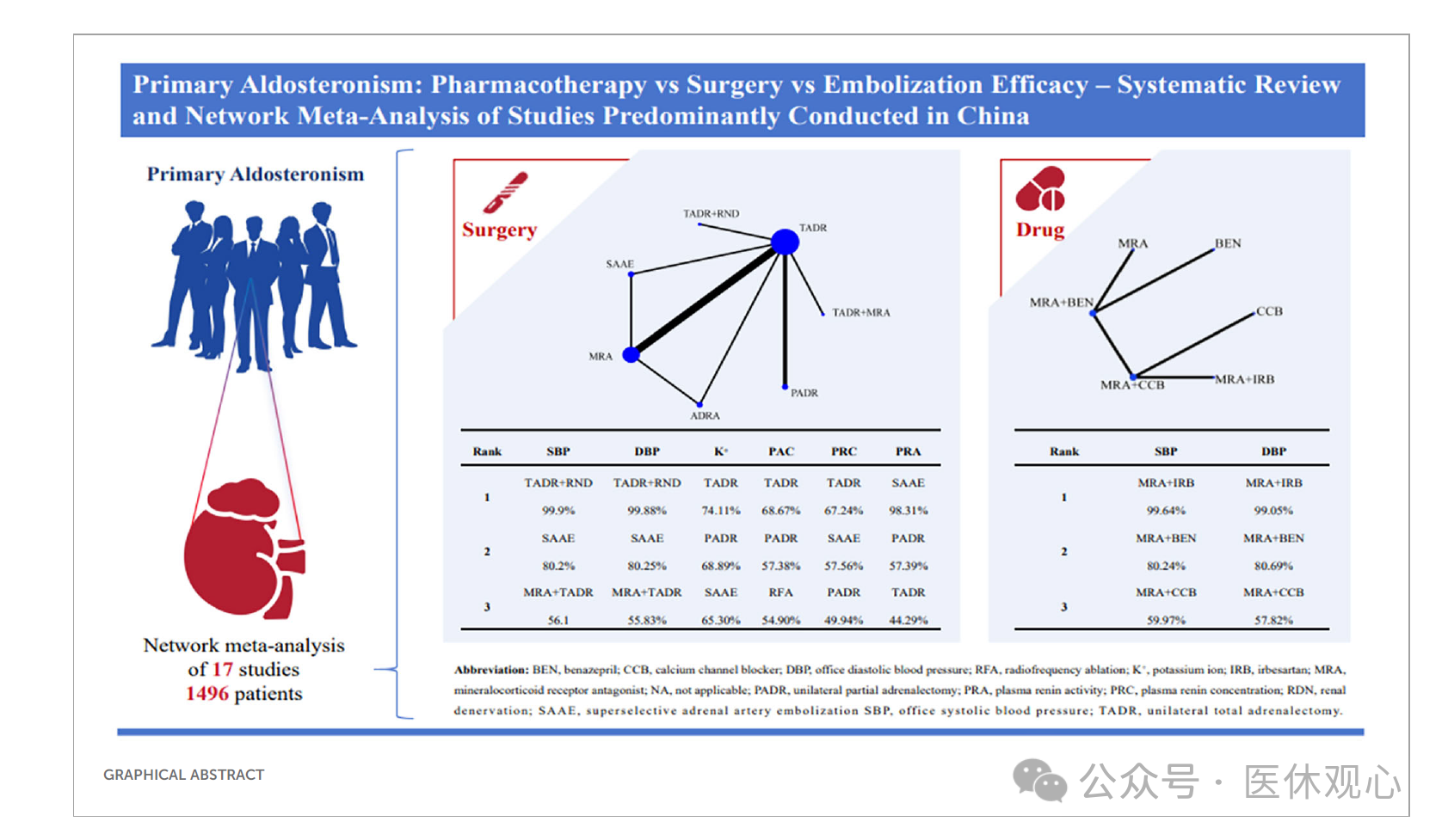 研究团队筛出17项研究、涉及1496名患者。值得注意的是,这些研究中76%都是在中国完成的,可以说非常贴合咱们国人的体质特点。 研究比较了10种具体方案,包括6种手术/微创方式和4种药物组合,看它们在降压、纠正低血钾、调节激素水平等方面的表现。 1. 降压效果冠军:手术+微创联合技 结果出乎意料:单侧肾上腺全切+肾动脉去交感神经术(TADR+RDN) 这个"组合拳",降压效果最猛!相比单纯吃药,收缩压多降了12.5mmHg,舒张压多降8.7mmHg。 为啥这么厉害?研究人员解释,这相当于"双重打击":一方面切除了醛固酮的"老巢",另一方面切断了交感神经对血压的"遥控指挥"。特别适合那些血压特别顽固、同时血钾很低的重症患者。 排第二的是超选择性肾上腺动脉栓塞(SAAE),收缩压能降低6.5mmHg。它的优势在于不用开刀,还能保留部分肾上腺功能,适合希望保留器官功能或身体较弱的患者。 2. 保护血钾冠军:部分切除术 在纠正低钾血症方面,单侧部分肾上腺切除术(PADR) 表现最佳,能让血钾提升0.64mmol/L。这个术式只切掉病变的肾上腺组织,保留健康部分,既解决问题又留有余地。 3. 药物治疗新发现:这个组合效果翻倍 对于不适合手术的患者,药物组合的选择也有讲究。研究显示:MRA+厄贝沙坦(IRB) 这个黄金搭档,降压效果比单用MRA强出一大截——收缩压多降18.9mmHg,舒张压多降22.1mmHg! 原因在于厄贝沙坦作为血管紧张素受体拮抗剂,与MRA作用于不同环节,形成"双重阻断",既增强疗效又能减少单药大剂量带来的副作用。 相比之下,MRA+钙通道阻滞剂(CCB)或MRA+贝那普利的效果就没那么突出了。