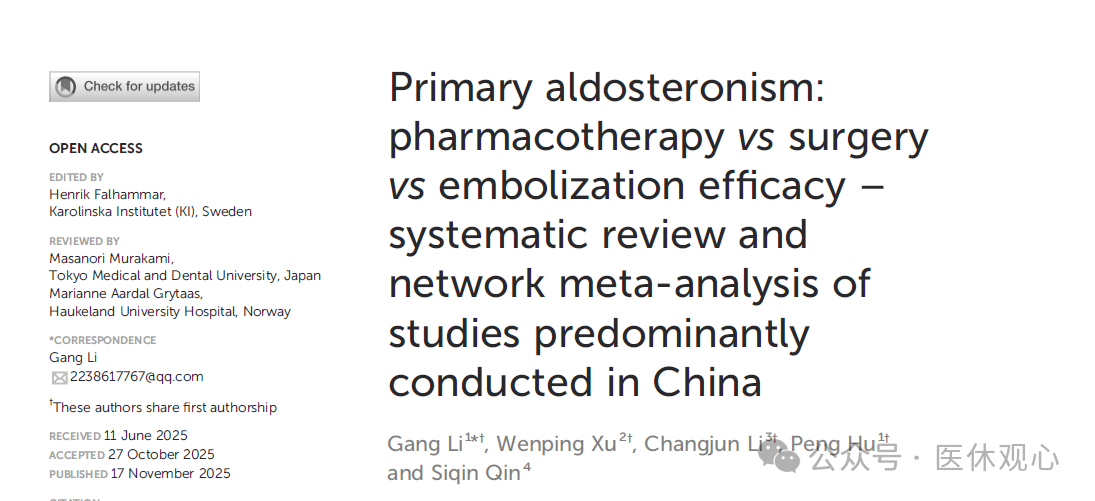 大家好,我是医休哥。一项由国内多家医院联合完成的研究,给原发性醛固酮增多症患者带来了重要启示。研究系统比较了药物、手术、微创栓塞三种主流疗法的效果,结果令人意外:最佳方案可能和你想的不一样!