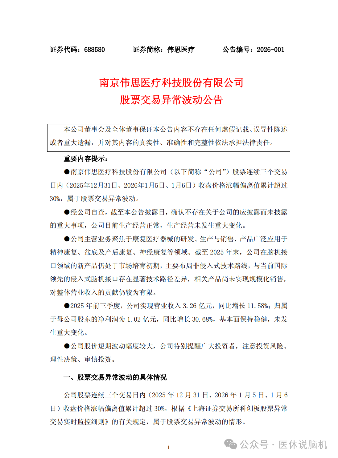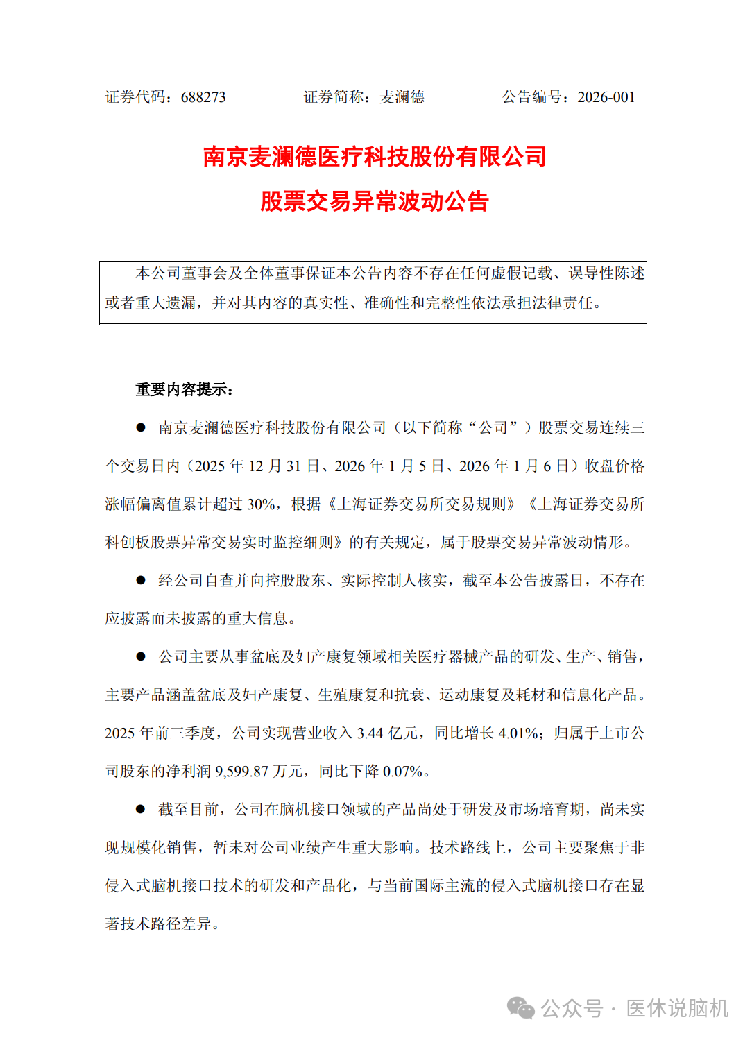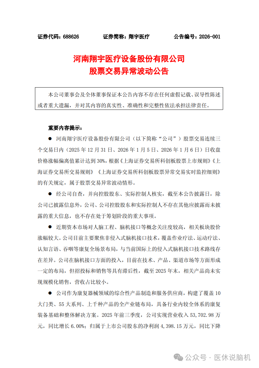 在板块热度上行阶段,多家上市公司陆续通过股票交易异常波动公告或相关披露,说明自身脑机接口业务进展及风险提示。翔宇医疗在公告中表示,公司目前主要聚焦非侵入式脑机接口技术,覆盖作业疗法、运动疗法、认知言语、吞咽等康复场景;公司在脑机接口方面已形成一定布局,但招投标与销售具有滞后性,截至2025年末相关产品尚未实现规模化销售,营收占比较小。