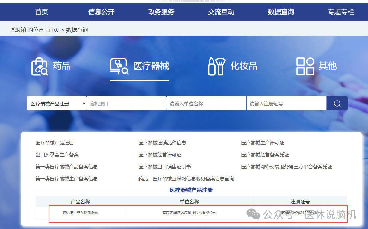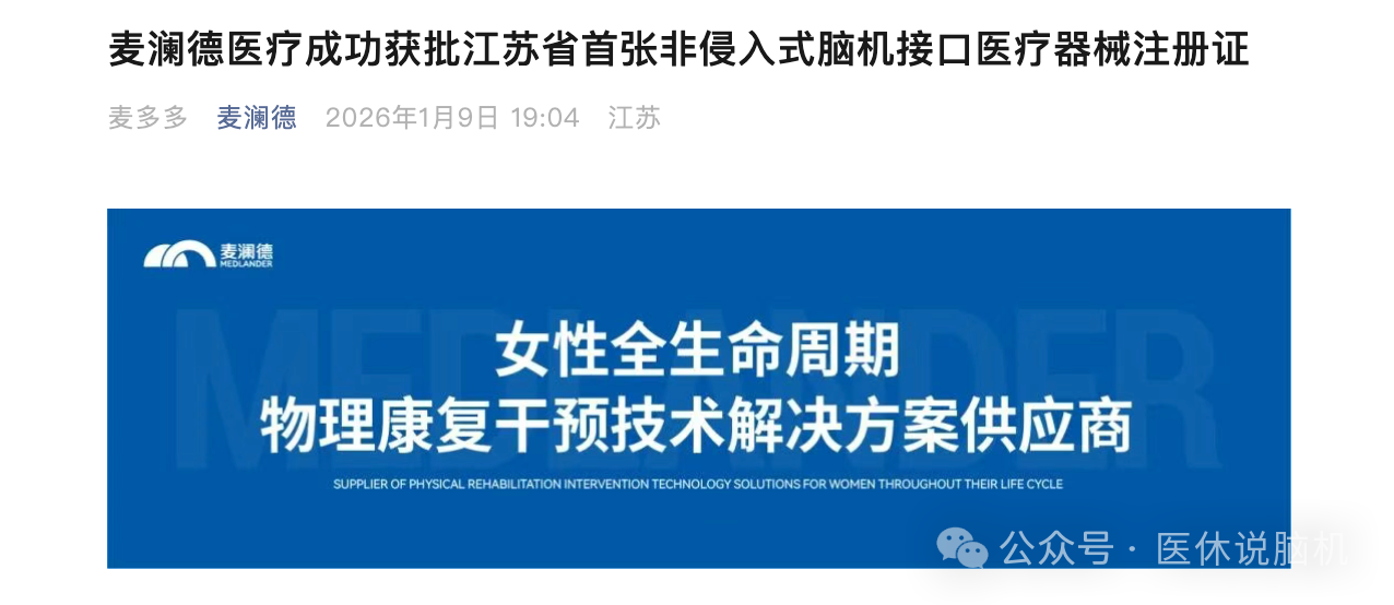 2026年1月8日,据麦澜德官方公众号和江苏省药品监督管理局披露,南京麦澜德医疗科技股份有限公司自主研发的“脑机接口经颅磁刺激仪”正式获得江苏省药品监督管理局颁发的医疗器械注册证,成为江苏省首个获证的非侵入式脑机接口相关产品。
