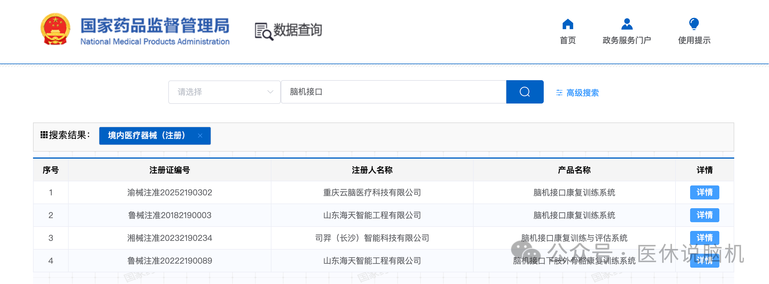 据国家医保局数据查询显示,目前带有脑机接口相关的注册证,一共有四张,只不过都是与康复训练系统相关的,还没有出现过脑机接口经颅磁刺激仪这类的注册证。