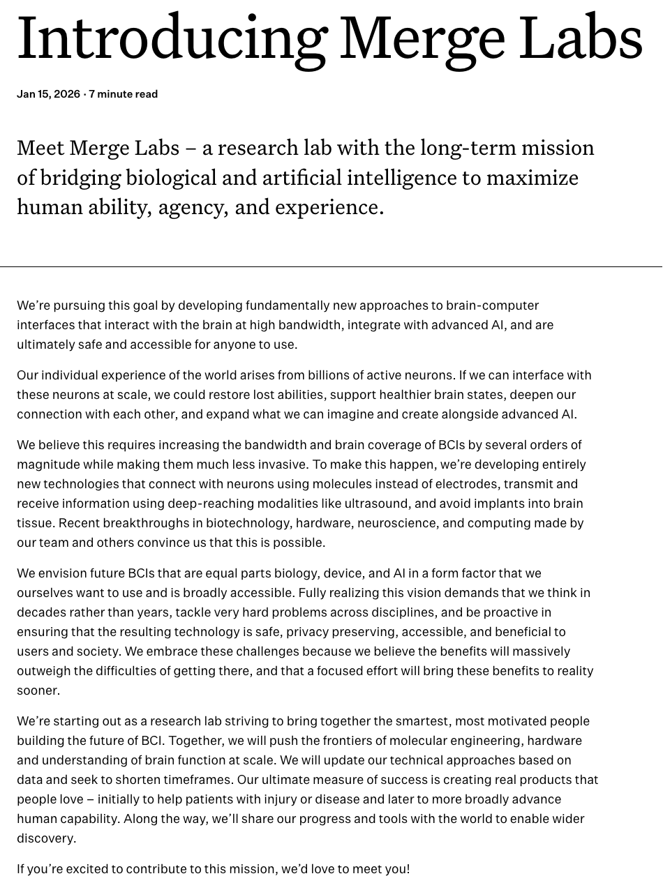 OpenAI 在官方公告中对 Merge Labs 的定位较明确:它是一个“研究实验室”,长期使命是连接生物智能与人工智能,以提升人的能力、能动性与体验。Merge Labs 也在其对外介绍中强调,团队希望研发“根本性的新方法”,实现与大脑的高带宽交互,并与先进 AI 深度结合,同时在安全性与可及性上做出突破,最终走向可以被更广泛人群使用的产品形态。公司层面对节奏的表述也相对克制,直言要按“几十年而不是几年”的尺度来推进。