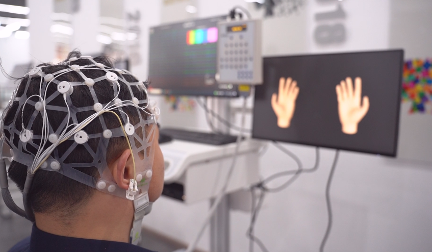 放松,集中精神,想象自己双手在抓握……记者戴上特制头套,亲身体验了一把“意念操控”。