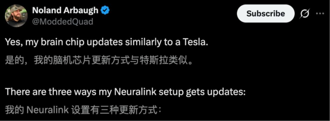 作为Neuralink的首位人类受试者,诺兰·阿博(Noland Arbaugh)近期披露了一些令人震惊的细节。作为初代N1植入体的拥有者,他向世界展示了一个全新的概念:人脑芯片的更新逻辑,竟然与特斯拉汽车的OTA升级如出一辙。