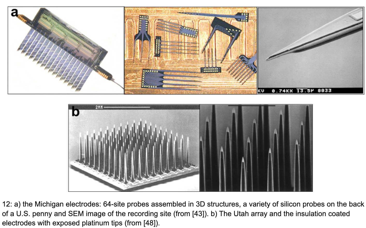 半导体工业带来的最大变化,是把电极从“手工尖针”带进了“可设计、可复制”的微加工体系。80 年代末到 90 年代,微加工硅探针快速成熟,典型代表包括密歇根探针(平面多通道探针)与犹他阵列(立体阵列)。它们把通道数、几何一致性、布线与封装形态,带到了一个过去很难想象的水平,神经记录从“单点”走向“阵列”,从“少量神经元”走向“神经元群体”。
