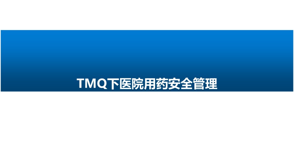 TMQ下医院用药安全管理医院概况目录背景目标执行过程Contents创新亮点成效评价22背景目标美国医学研究所数据表明:用药错误每年伤及150万人,导致35亿美元的额外医疗支出。参考文献:AdersonP,TownsendT.Medicationerrors:don`tletthemhappentoyou[J].AmNurseToday,2010.5(3):23-27.3背景目标➢静脉治疗管理乱静脉输液是国际公认最危险的给药方式,“能吃药不打针,能打针不输液”是世卫组织确定的合理用药原则。但在许多国人心里,输液却成了“最简单快捷”的治疗方式。据不完全统计,我国每年输液量超百亿瓶,每年约20万人死于输液不良反应。国际上平均每人输液2.5-3.3...