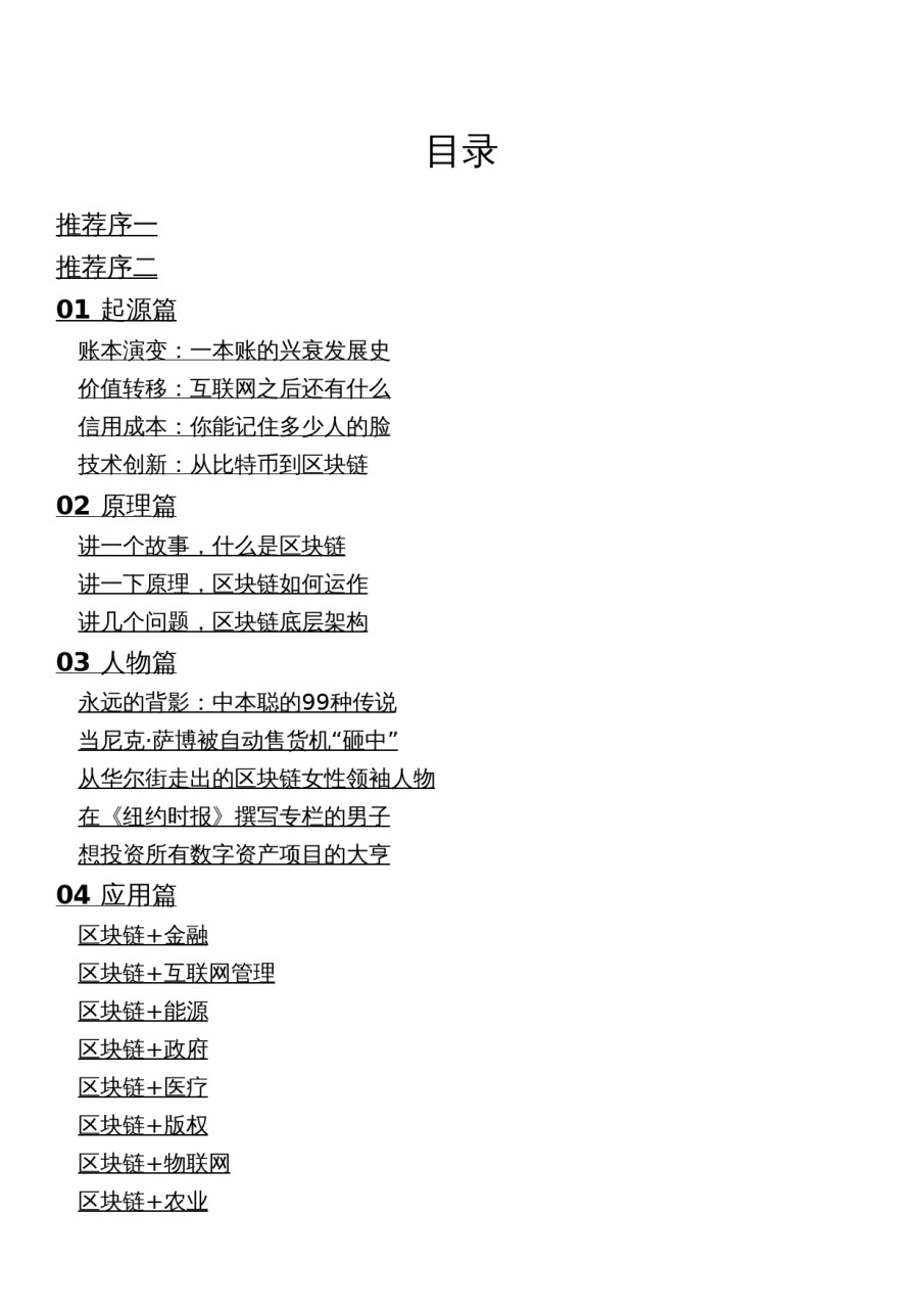 图说区块链徐明星田颖李霁月著中信出版社目录推荐序一推荐序二01起源篇账本演变:一本账的兴衰发展史价值转移:互联网之后还有什么信用成本:你能记住多少人的脸技术创新:从比特币到区块链02原理篇讲一个故事,什么是区块链讲一下原理,区块链如何运作讲几个问题,区块链底层架构03人物篇永远的背影:中本聪的99种传说当尼克·萨博被自动售货机“砸中”从华尔街走出的区块链女性领袖人物在《纽约时报》撰写专栏的男子想投资所有数字资产项目的大亨04应用篇区块链+金融区块链+互联网管理区块链+能源区块链+政府区块链+医疗区块链+版权区块链+物联网区块链+农业区块链+慈...