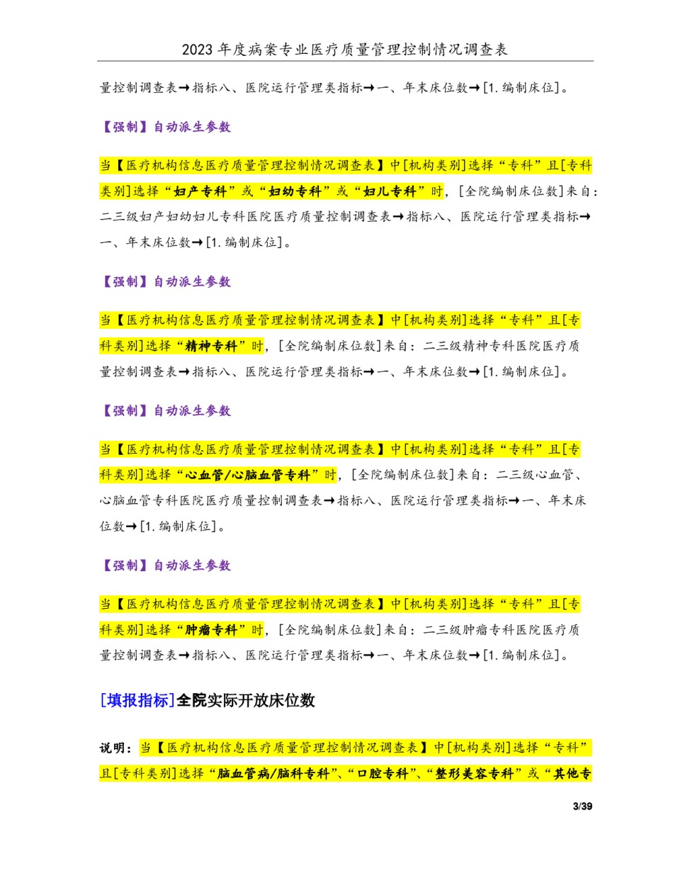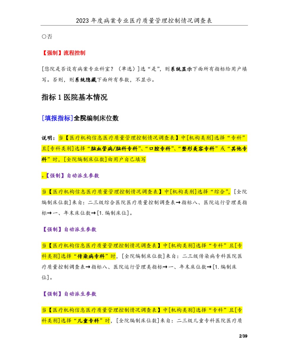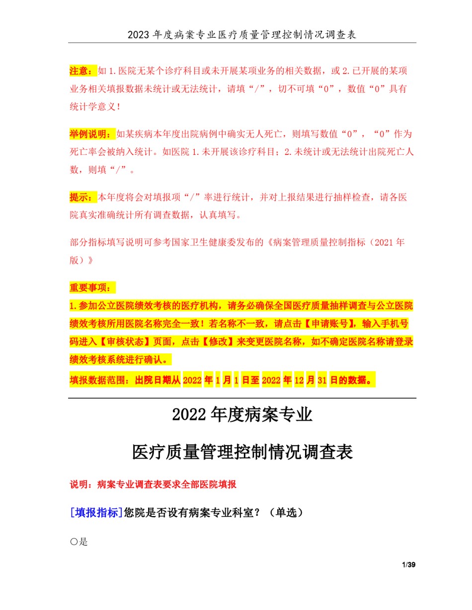 2023年度病案专业医疗质量管理控制情况调查表注意:如1.医院无某个诊疗科目或未开展某项业务的相关数据,或2.已开展的某项业务相关填报数据未统计或无法统计,请填“/”,切不可填“0”,数值“0”具有统计学意义!举例说明:如某疾病本年度出院病例中确实无人死亡,则填写数值“0”,“0”作为死亡率会被纳入统计。如医院1.未开展该诊疗科目;2.未统计或无法统计出院死亡人数,则填“/”。提示:本年度将会对填报项“/”率进行统计,并对上报结果进行抽样检查,请各医院真实准确统计所有调查数据,认真填写。部分指标填写说明可参考国家卫生健康委发布的《病案管理质量...