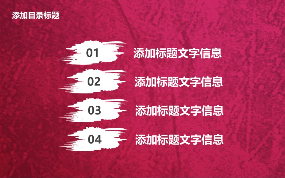 时尚泼墨风格PPT模板添加目录标题添加标题文字信息添加标题文字信息01添加标题文字信息02添加标题文字信息0304添加目录标题请输入文本03请输入标题请输入文本02请输入文本请输入标题请输入文本请输入标题01请输入文本请输入文本添加目录标题添加标题文字信息添加标题文字信息添加标题添加标题文字信息文字信息添加目录标题请输入文本入文本请输入文本请输入文本01请输入标题请输入标题0203请输入标题请输入文本请输入文本添加目录标题02请03输请请入请输入请01输文输本入文输入标本入标请文题输本题入标题请输入标题PPT模板下载:www.1ppt.com/moban/行业PPT模板:www.1p...