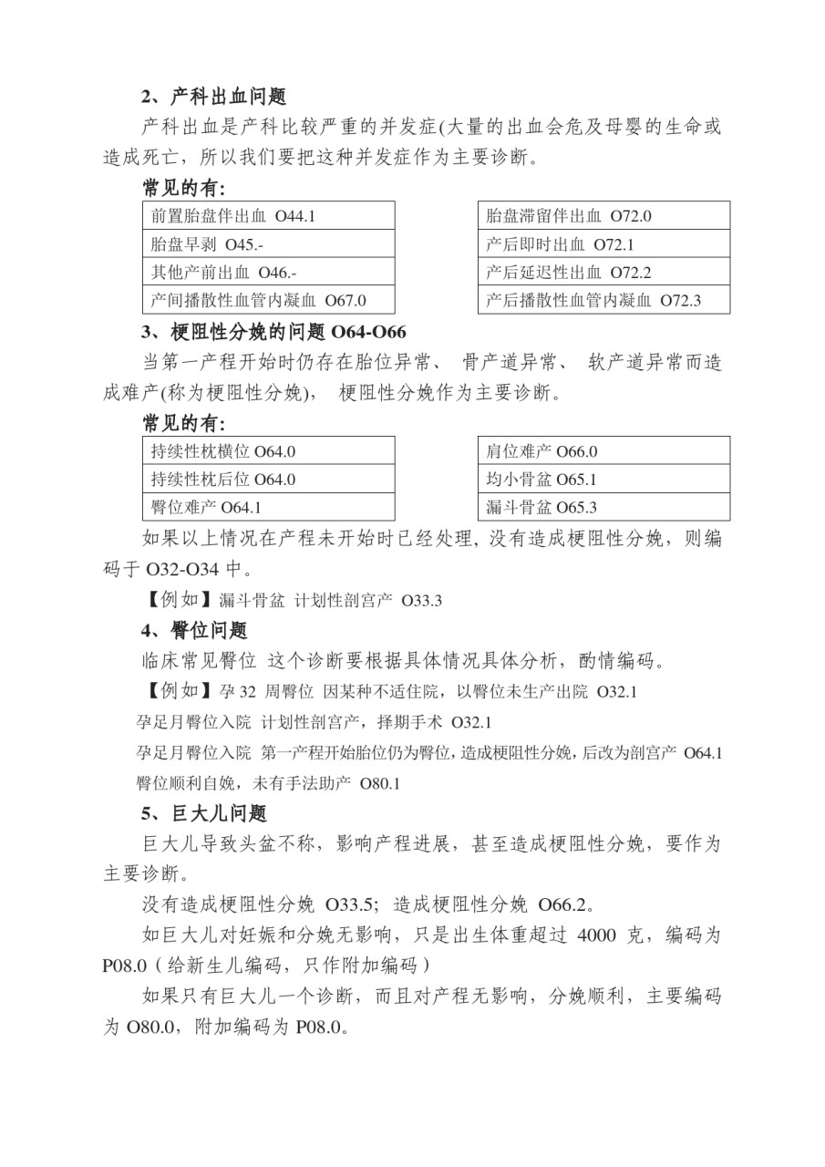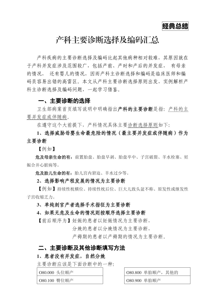 经典总结产科主要诊断选择及编码汇总产科疾病的主要诊断选择及编码比起其他病种相对较难,其原因就在于产科并发症涉及范围较广,包括产前、产时和产后的并发症,有母亲的情况,还有婴儿的情况,因而产科主诊断选择和编码是临床医师和编码员容易出错的高雷区。本文从产科主要诊断选择原则出发,实例解析产科主诊断选择及编码问题,一起学习借鉴。一、主要诊断的选择卫生部病案首页填写说明中明确指出产科的主要诊断是指:产科的主要并发症或伴随病。在遵守这个大前提下,产科情况具体主要诊断选择原则如下:1、选择威胁母婴生命最危险的情况(最主要并发症或伴随病)作为...