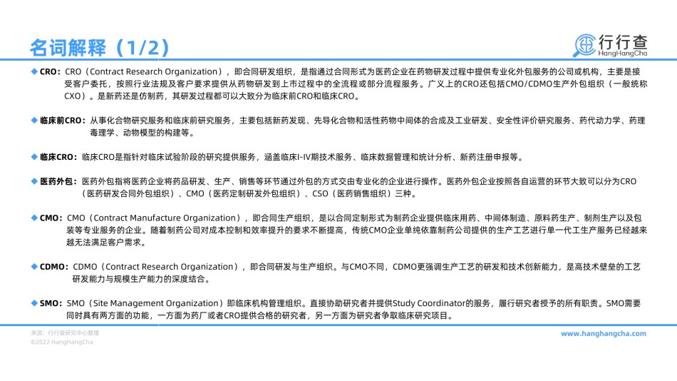 2021年中国CRO行业研究报告——综合服务+产品赋能,市场热度持续提升概览标签:CRO、CXO、CMO、CDMO、CSO、SMO、药物发现、药物评估、药物安全、临床前CRO、临床CRO、新药审核、毒理学、药物筛选、先导化合物、药物警戒、一致性评价、仿制药、IQVIA、LabCorp、药明康德、康龙化成、泰格医药、新生源行行查简介www.hanghangcha.com来源:行行查研究中心整理©2022HangHangCha名词解释(1/2)CRO:CRO(ContractResearchOrganization),即合同研发组织,是指通过合同形式为医药企业在药物研发过程中提供专业化外包服务的公司或机构,主要是接受客户委托,按照行业法规及...